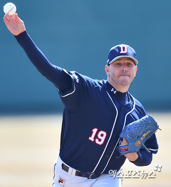 [엑스포츠뉴스=대전, 권혁재 기자] 12일 오후 대전광역시 중구 한밭야구장에서 열린 '2015 타이어뱅크 KBO리그' 두산 베어스와 한화 이글스의 경기에서 두산 선발투수 마야가 힘차게 공을 던지고 있다.