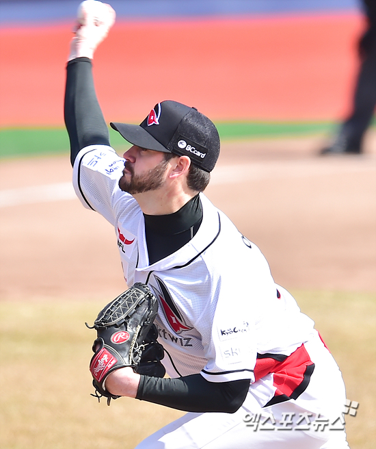[엑스포츠뉴스=수원, 권혁재 기자] 14일 오후 경기도 수원시 장안구 수원KT위즈파크에서 열린 '2015 타이어뱅크 KBO리그' 두산 베어스와 kt 위즈의 시범경기에서 kt 선발투수 이원이 힘차게 공을 던지고 있다.