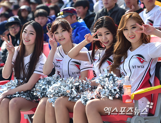 [엑스포츠뉴스=수원, 권혁재 기자] 14일 오후 경기도 수원시 장안구 수원KT위즈파크에서 열린 '2015 타이어뱅크 KBO리그' 두산 베어스와 kt 위즈의 시범경기에서 kt 치어리더들이 포즈를 취하고 있다.