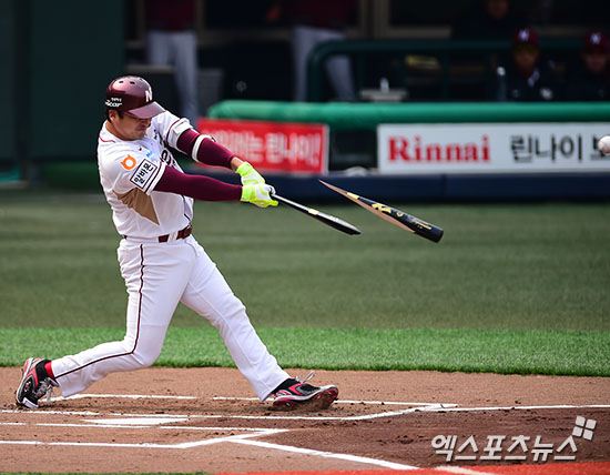 [엑스포츠뉴스=김한준 기자] 15일 오후 서울 목동야구장에서 열린 '2015 타이어뱅크 KBO리그' 롯데 자이언츠와 넥센 히어로즈와의 시범경기, 1회말 넥센 이택근이 중견수 앞 안타를 날리고 있다.