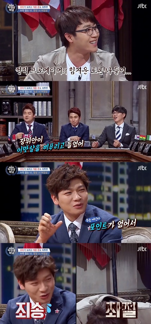 이날 홍진호는 '부자가 되려고 적은 돈도 허투로 쓰지 않는 나, 비정상인가'란 안건에 대해 자신의 의견을 밝히려 했다.