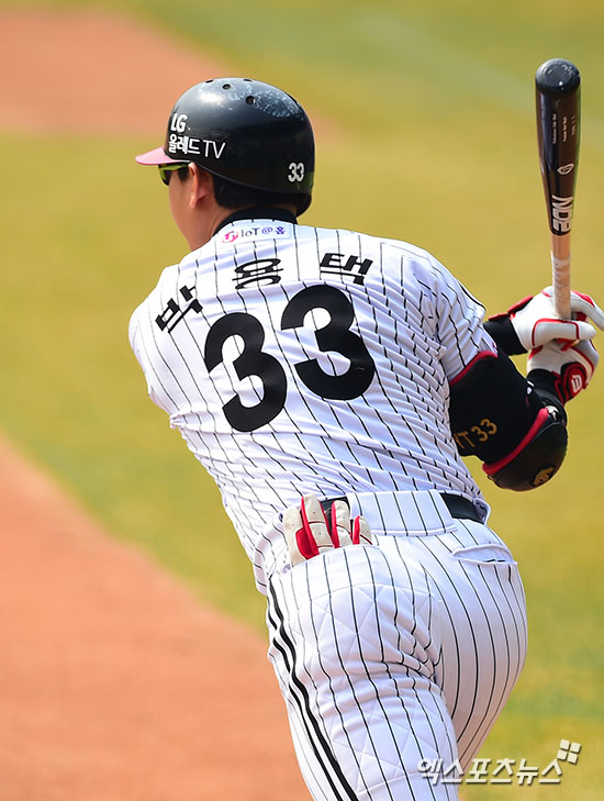 [엑스포츠뉴스=김한준 기자] 21일 오후 서울 송파구 잠실야구장에서 열린 '2015 타이어뱅크 KBO리그' 두산 베어스와 LG 트윈스의 시범경기, 1회말 2사 LG 박용택이 중견수쪽 안타를 날리고 있다.