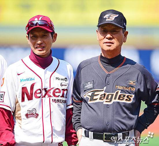 [엑스포츠뉴스=김한준 기자] 28일 오후 서울 목동야구장에서 열린 '2015 타이어뱅크 KBO리그' 한화 이글스와 넥센 히어로즈와의 경기, 경기 전 넥센 염경엽 감독과 한화 김성근 감독이 개막전 행사에 참여하고 있다.
