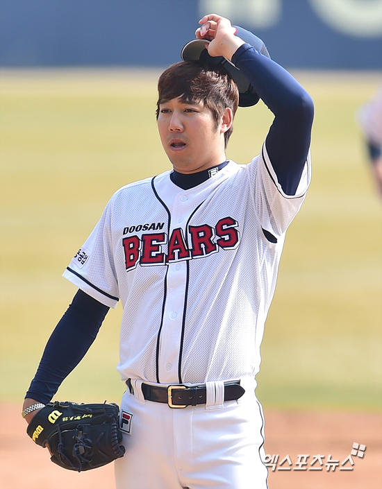 [엑스포츠뉴스=권혁재 기자] 29일 오후 서울 송파구 잠실야구장에서 열린 '2015 타이어뱅크 KBO리그' NC 다이노스와 두산 베어스의 경기에서 두산이 1-0으로 앞선 5회초 1아웃 2, 3루 NC 모창민에게 1타점 적시타를 맞은 두산 선발투수 장원준이 모자를 벗고 심호흡을 하고 있다.