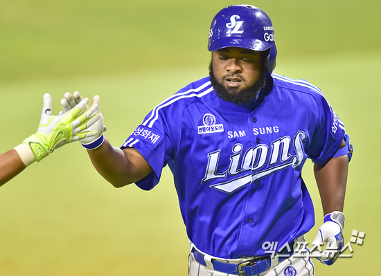 [엑스포츠뉴스=권혁재 기자] 3일 오후 서울 송파구 잠실야구장에서 열린 '2015 타이어뱅크 KBO리그' 삼성 라이온즈와 LG 트윈스의 경기에서 삼성이 2-1으로 앞선 6회초 삼성 나바로가 솔로포를 날리고 들어와 동료들과 하이파이브 하고 있다.