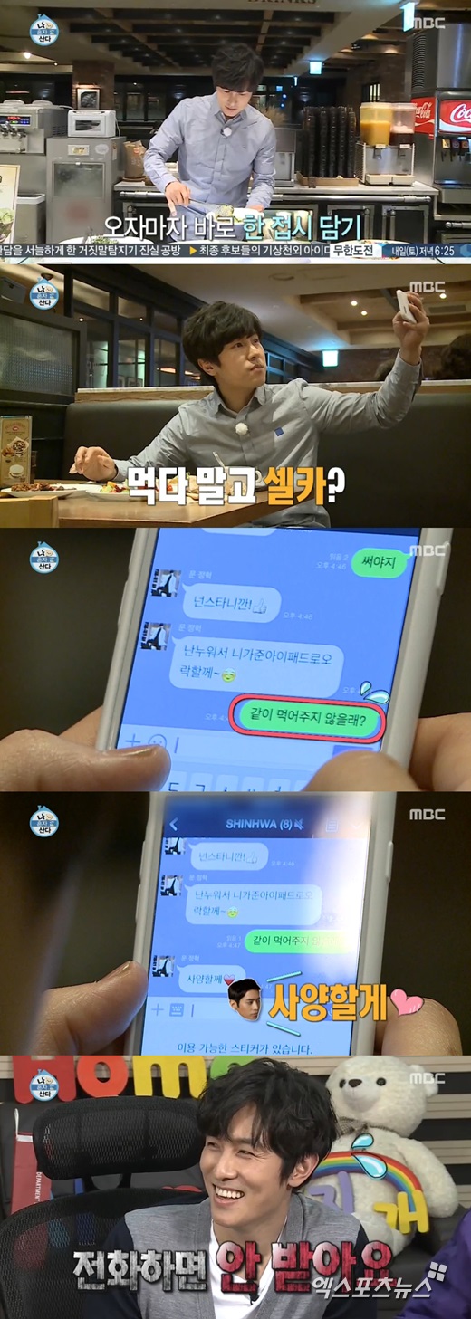 이날 김동완은 혼자 패밀리 레스토랑에서 샐러드바를 이용했다. 김동완은 셀카를 찍어 신화 멤버들이 모인 단체 채팅방에 전송했다.