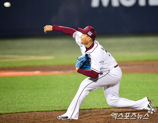 [엑스포츠뉴스=김한준 기자] 5일 오후 서울 목동야구장에서 열린 '2015 타이어뱅크 KBO리그' SK 와이번스와 넥센 히어로즈와의 경기, 9회초 2사 1,2루 넥센 김영민이 공을 힘차게 던지고 있다.