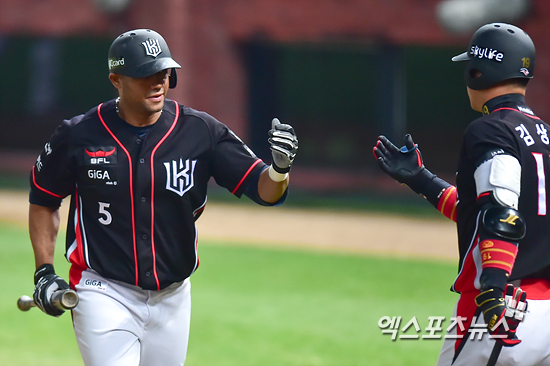 [엑스포츠뉴스=문학, 권혁재 기자] 7일 오후 인천광역시 인천SK행복드림구장에서 열린 '2015 타이어뱅크 KBO리그' kt 위즈와 SK 와이번스의 경기, 6회초 kt 마르테가 솔로포를 날리고 들어와 김상현과 하이파이브 하고 있다.
