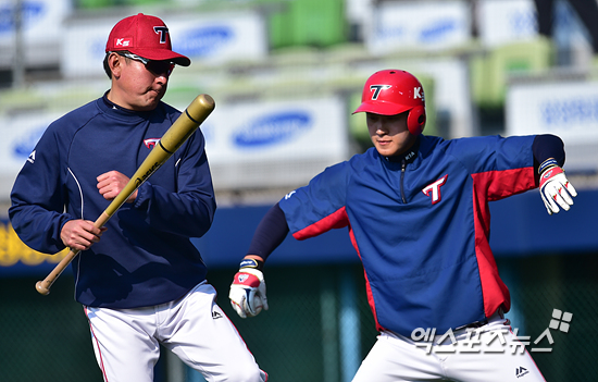 [엑스포츠뉴스=대구, 권혁재 기자] 11일 오후 대구광역시 북구 대구시민야구장에서 열릴 예정인 '2015 타이어뱅크 KBO리그' KIA 타이거즈와 삼성 라이온즈의 경기, KIA 김기태 감독이 고영우에게 타격 훈련을 지도하고 있다.