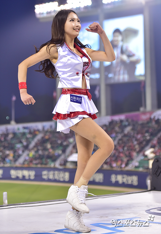 [엑스포츠뉴스=권혁재 기자] 15일 오후 서울 송파구 잠실야구장에서 열린 '2015 타이어뱅크 KBO리그' KIIA 타이거즈와 LG 트윈스의 경기, LG 치어리더 김민지가 화려한 안무를 선보이고 있다.