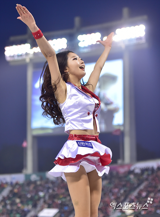 [엑스포츠뉴스=권혁재 기자] 15일 오후 서울 송파구 잠실야구장에서 열린 '2015 타이어뱅크 KBO리그' KIIA 타이거즈와 LG 트윈스의 경기, LG 치어리더 김민지가 화려한 안무를 선보이고 있다.