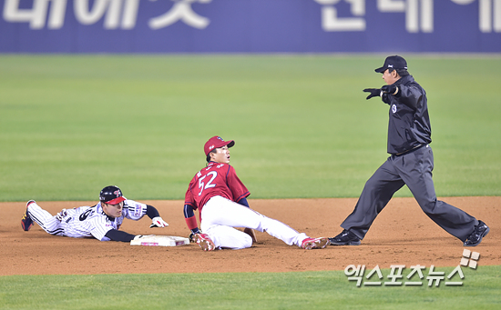 [엑스포츠뉴스=권혁재 기자] 15일 오후 서울 송파구 잠실야구장에서 열린 '2015 타이어뱅크 KBO리그' KIIA 타이거즈와 LG 트윈스의 경기, KIA가 5-2로 앞선 7회말 무사 1루 LG 문선재가 2루 도루를 시도 슬라이딩 세이프 되고 있다.
