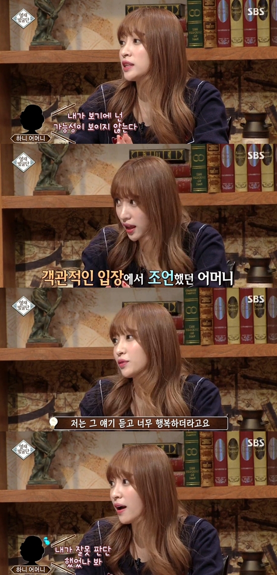 [엑스포츠뉴스=조재용 기자] '영재발굴단'에서 EXID 하니가 가수를 반대한 어머니로부터 칭찬을 받았다고 말했다.