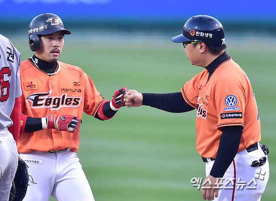 [엑스포츠뉴스=대전, 권혁재 기자] 24일 오후 대전광역시 중구 한밭야구장에서 열린 '2015 타이어뱅크 KBO리그' SK 와이번스와 한화 이글스의 경기, 1회말 선두타자 한화 이용규가 좌전 안타를 날리고 1루 코치와 하이파이브 하고 있다.