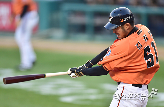 [엑스포츠뉴스=대전, 권혁재 기자] 24일 오후 대전광역시 중구 한밭야구장에서 열린 '2015 타이어뱅크 KBO리그' SK 와이번스와 한화 이글스의 경기, 1회말 1아웃 2루 SK 김경언이 1타점 적시타를 날리고 있다.