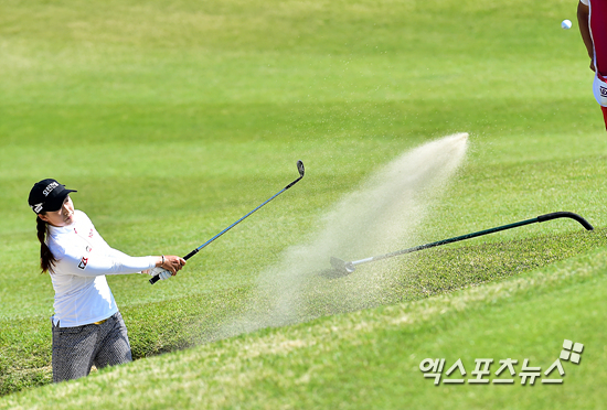 [엑스포츠뉴스=김해, 권혁재 기자] 26일 오전 경남 김해 가야 컨트리클럽(파72ㅣ6,649야드)에서 열린 '넥센 세인트나인 마스터즈 2015(총상금 5억 원, 우승상금 1억 원)' 최종3라운드 경기, 김보경(29, 요진건설)이 18번홀 벙커샷을 하고 있다.