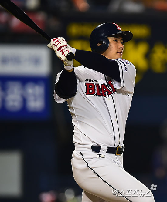 [엑스포츠뉴스=김한준 기자] 8일 오후 서울 송파구 잠실야구장에서 열린 '2015 타이어뱅크 KBO리그' 한화 이글스와 두산 베어스의 경기, 4회말 1사 1루 두산 김재환이 동점을 만드는 투런 홈런을 날리고 있다.