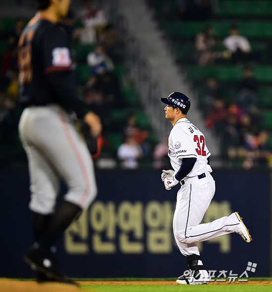 [엑스포츠뉴스=김한준 기자] 8일 오후 서울 송파구 잠실야구장에서 열린 '2015 타이어뱅크 KBO리그' 한화 이글스와 두산 베어스의 경기, 4회말 1사 1루 두산 김재환이 투런 홈런을 날린 후 그라운드를 돌고 있다.