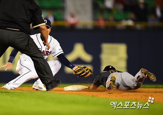 [엑스포츠뉴스=김한준 기자] 8일 오후 서울 송파구 잠실야구장에서 열린 '2015 타이어뱅크 KBO리그' 한화 이글스와 두산 베어스의 경기, 9회초 무사 1루 한화 정근우가 2루 도루에 성공하고 있다.
