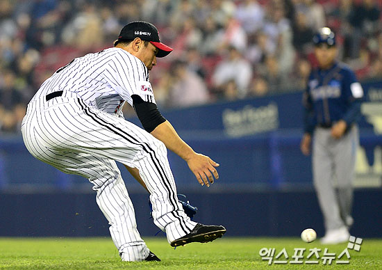 [엑스포츠뉴스=권태완 기자] 14일 오후 서울 송파구 잠실야구장에서 열린 '2015 타이어뱅크 KBO리그' NC 다이노스와 LG 트윈스의 경기에 ​0:0 9회초 무사 주자 1-2루에서 이호준의 희생번트를 이동현이 잡아 1루 아웃시키고 있다.