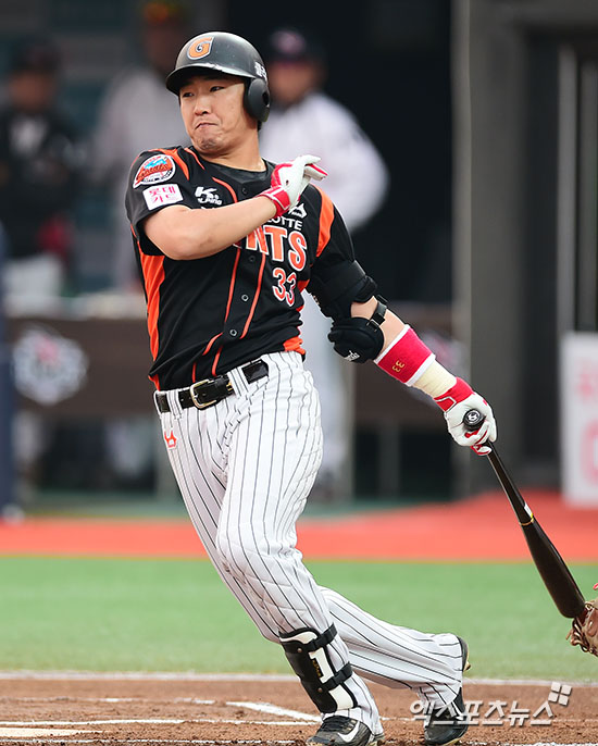 [엑스포츠뉴스=수원, 김한준 기자] 15일 오후 경기도 수원시 장안구 수원kt위즈파크에서 열린 '2015 타이어뱅크 KBO리그' 롯데 자이언츠와 kt 위즈의 경기, 1회초 롯데 정훈이 타격을 하고 있다.