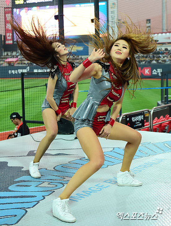 [엑스포츠뉴스=수원, 김한준 기자] 15일 오후 경기도 수원시 장안구 수원kt위즈파크에서 열린 '2015 타이어뱅크 KBO리그' 롯데 자이언츠와 kt 위즈의 경기, kt 치어리더들이 멋진 공연을 선보이고 있다.