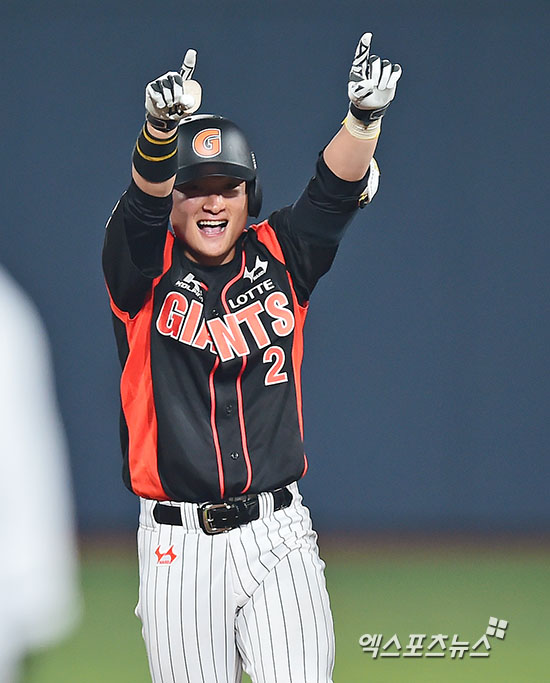[엑스포츠뉴스=수원, 김한준 기자] 15일 오후 경기도 수원시 장안구 수원kt위즈파크에서 열린 '2015 타이어뱅크 KBO리그' 롯데 자이언츠와 kt 위즈의 경기, 12회초 2사 1,2루 롯데 안중열이 2타점 2루타를 날린 후 기뻐하고 있다.