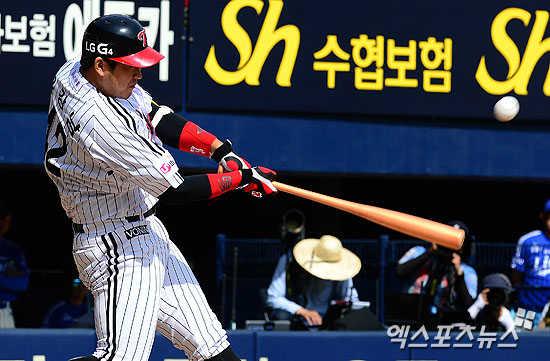 [엑스포츠뉴스=권태완 기자] 31일 오후 서울 송파구 잠실야구장에서 열린 '2015 타이어뱅크 KBO리그' 삼성 라이온즈와 LG 트윈스의 경기에 0:6으로 뒤진 4회말 2사 주자 1-2루에서 유강남이 좌중간 안타성 타구를 쳤지만 좌익수 플라이 아웃되고 있다.