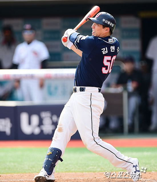 [엑스포츠뉴스=수원, 김한준 기자] 31일 오후 경기도 수원시 장안구 수원kt위즈파크에서 열린 '2015 타이어뱅크 KBO리그' 두산 베어스와 kt 위즈의 경기, 6회초 2사 2루 두산 김현수가 1타점 2루타를 날리고 있다.