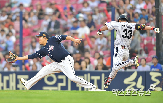 [엑스포츠뉴스=권혁재 기자] 10일 오후 서울 송파구 잠실야구장에서 열린 '2015 타이어뱅크 KBO리그' 두산 베어스와 LG 트윈스의 경기, LG가 3-0으로 앞선 3회말 LG 박용택이 2루 땅볼에 전력질주 하여 1루에서 세이프 되고 있다.