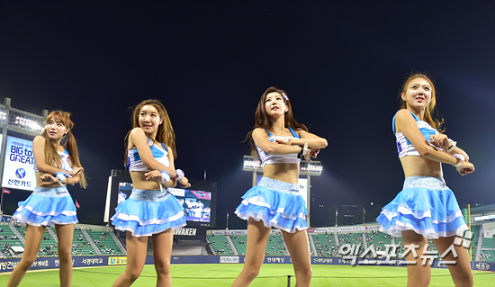 [엑스포츠뉴스=권혁재 기자] 10일 오후 서울 송파구 잠실야구장에서 열린 '2015 타이어뱅크 KBO리그' 두산 베어스와 LG 트윈스의 경기, 두산 치어리더들이 화려한 안무를 선보이고 있다.