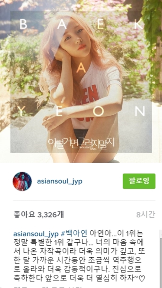 [엑스포츠뉴스=정희서 기자] 박진영 JYP 프로듀서가 백아연의 차트 1위를 축하했다.