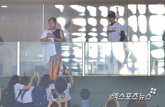 슈퍼주니어 강인과 엑소 백현이 스카이박스에서 경기를 관람하고 있다.