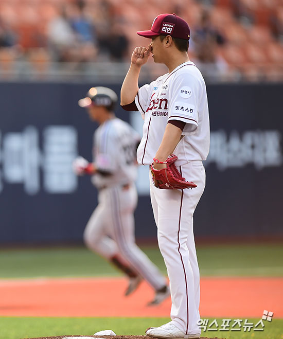 [엑스포츠뉴스=김한준 기자] 19일 오후 서울 목동야구장에서 열린 '2015 타이어뱅크 KBO리그' LG 트윈스와 넥센 히어로즈와의 경기, 1회초 넥센 선발투수 송신영이 LG 박용택에게 솔로 홈런을 허용한 뒤 아쉬워하고 있다.