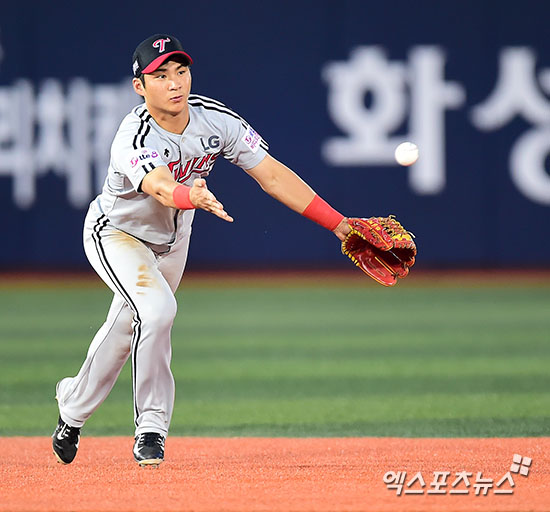 [엑스포츠뉴스=김한준 기자] 19일 오후 서울 목동야구장에서 열린 '2015 타이어뱅크 KBO리그' LG 트윈스와 넥센 히어로즈와의 경기, 5회말 1사 1,2루 LG 오지환이 넥센 박동원의 타구를 잡아 2루로 송구하고 있다.