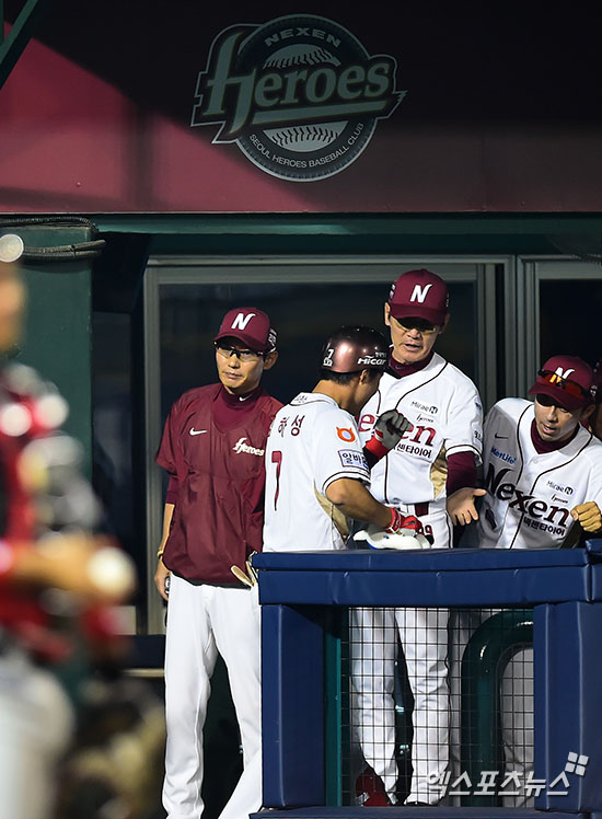 [엑스포츠뉴스=김한준 기자] 19일 오후 서울 목동야구장에서 열린 '2015 타이어뱅크 KBO리그' LG 트윈스와 넥센 히어로즈와의 경기, 6회말 1사 넥센 김하성이 솔로 홈런을 날린 후 더그아웃에서 염경엽 감독과 하이파이브를 하고 있다.