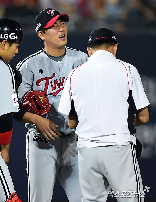 [엑스포츠뉴스=김한준 기자] 19일 오후 서울 목동야구장에서 열린 '2015 타이어뱅크 KBO리그' LG 트윈스와 넥센 히어로즈와의 경기, 7회말 LG 선발투수 우규민이 넥센 박병호의 타구에 손을 맞은 뒤 고통스러워하고 있다.