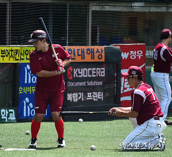[엑스포츠뉴스=김한준 기자] 21일 오후 서울 목동야구장에서 열리는 '2015 타이어뱅크 KBO리그' LG 트윈스와 넥센 히어로즈와의 경기, 넥센 서건창이 티배팅을 하고 있다.