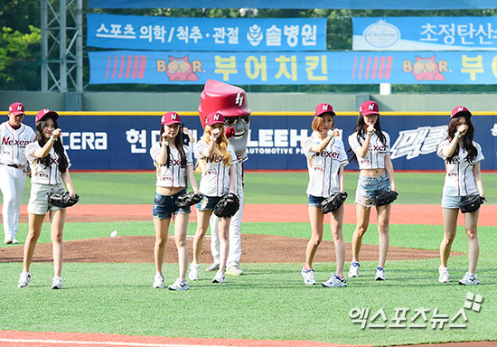 [엑스포츠뉴스=김한준 기자] 21일 오후 서울 목동야구장에서 열린 '2015 타이어뱅크 KBO리그' LG 트윈스와 넥센 히어로즈와의 경기, 걸그룹 달샤벳이 시구에 임하고 있다.