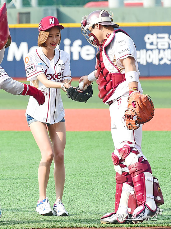 [엑스포츠뉴스=김한준 기자] 21일 오후 서울 목동야구장에서 열린 '2015 타이어뱅크 KBO리그' LG 트윈스와 넥센 히어로즈와의 경기, 걸그룹 달샤벳 가은이 시구를 마친 후 넥센 박동원에게 공을 건네받고 있다.