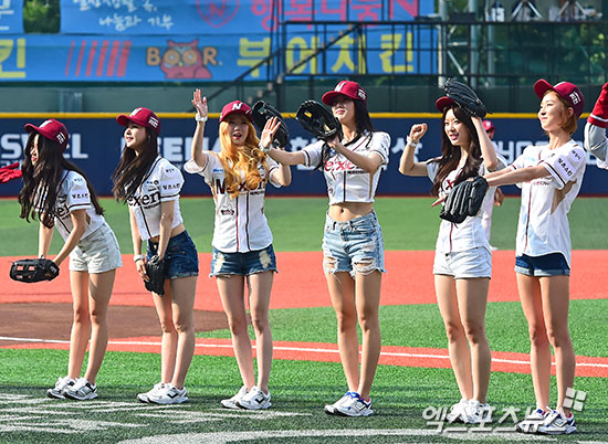 [엑스포츠뉴스=김한준 기자] 21일 오후 서울 목동야구장에서 열린 '2015 타이어뱅크 KBO리그' LG 트윈스와 넥센 히어로즈와의 경기, 걸그룹 달샤벳이 시구를 마친 후 관중들을 향해 인사를 하고 있다.