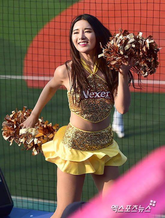 [엑스포츠뉴스=김한준 기자] 21일 오후 서울 목동야구장에서 열린 '2015 타이어뱅크 KBO리그' LG 트윈스와 넥센 히어로즈와의 경기, 넥센 치어리더가 멋진 공연을 선보이고 있다.