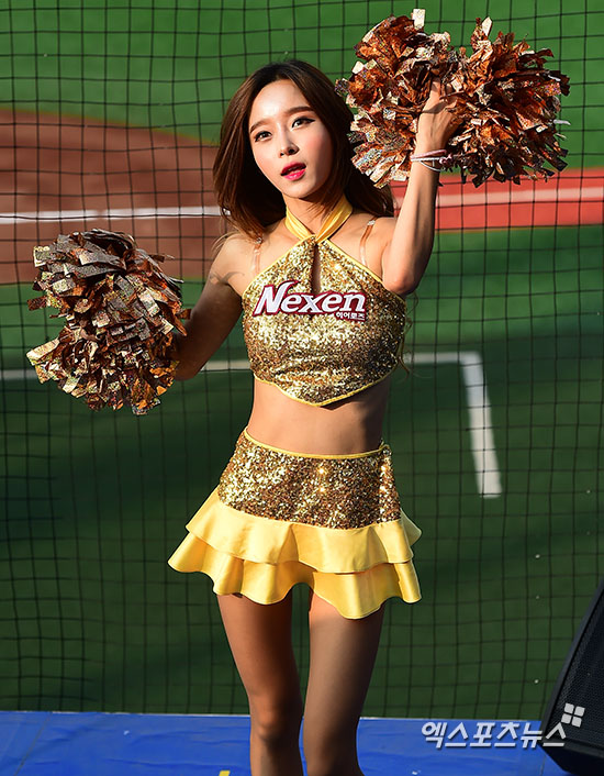 [엑스포츠뉴스=김한준 기자] 21일 오후 서울 목동야구장에서 열린 '2015 타이어뱅크 KBO리그' LG 트윈스와 넥센 히어로즈와의 경기, 넥센 치어리더 인아가 멋진 공연을 선보이고 있다.