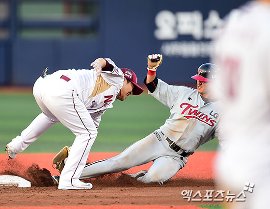 [엑스포츠뉴스=김한준 기자] 21일 오후 서울 목동야구장에서 열린 '2015 타이어뱅크 KBO리그' LG 트윈스와 넥센 히어로즈와의 경기, 7회초 1사 1루 LG 박용택이 2루 도루를 시도하다 아웃되고 있다.