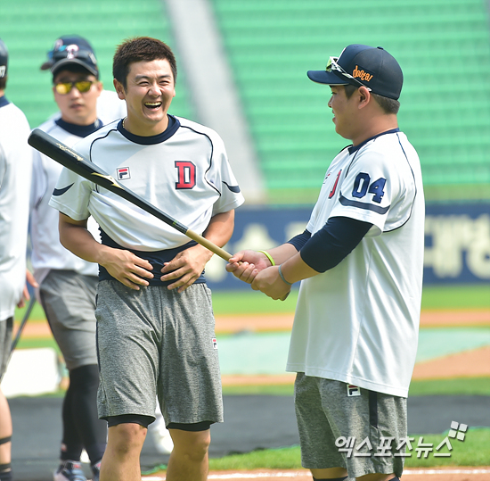 [엑스포츠뉴스=권혁재 기자] 5일 오후 서울 송파구 잠실야구장에서 열릴 '2015 타이어뱅크 KBO리그' 넥센 히어로즈와 두산 베어스의 경기에 앞서 반바지를 입은 두산 선수들이 훈련에 임하고 있다.