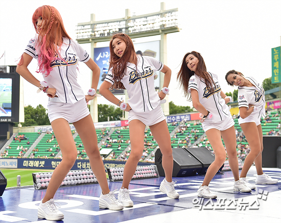 [엑스포츠뉴스=권혁재 기자] 5일 오후 서울 송파구 잠실야구장에서 열린 '2015 타이어뱅크 KBO리그' 넥센 히어로즈와 두산 베어스의 경기에서 두산 치어리더들이 화려한 안무를 선보이고 있다.