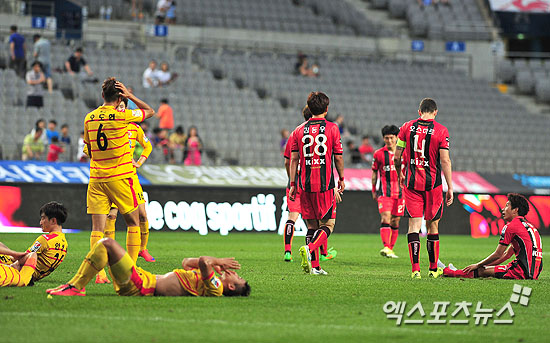 [엑스포츠뉴스=권태완 기자] 5일 오후 서울 상암동 서울월드컵경기장에서 열린 '2015 현대오일뱅크 K리그 클래식' FC 서울과 광주 FC의 경기에 양팀이 1:1 무승부로 경기를 마치자 아쉬워 하고 있다.
