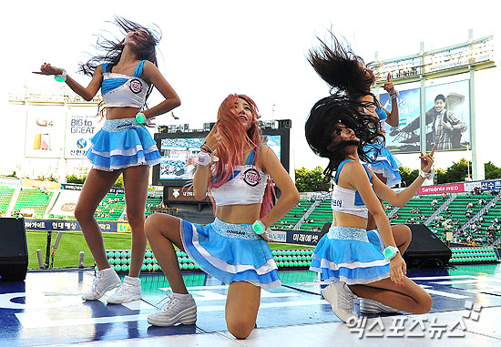 [엑스포츠뉴스=권태완 기자] 16일 오후 서울 송파구 잠실야구장에서 열린 '2015 타이어뱅크 KBO리그 ' 두산 베어스와 kt 위즈의 경기에 두산 치어리더들이 공연을 하고 있다.