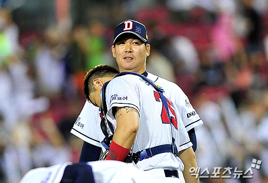 [엑스포츠뉴스=권태완 기자] 16일 오후 서울 송파구 잠실야구장에서 열린 '2015 타이어뱅크 KBO리그 ' 두산 베어스와 kt 위즈의 경기에 두산이 3:0으로 승리해 이현승과 양의지가 기뻐하고 있다.