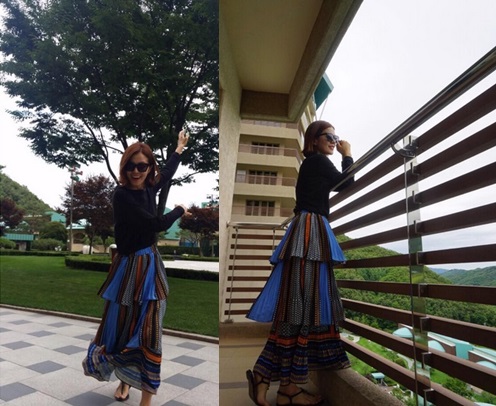사진 속 김성은은 발목까지 내려오는 스커트를 착용하고 코믹한 포즈를 취하고 있다. 짧아진 단발 머리가 상큼함을 더한다.